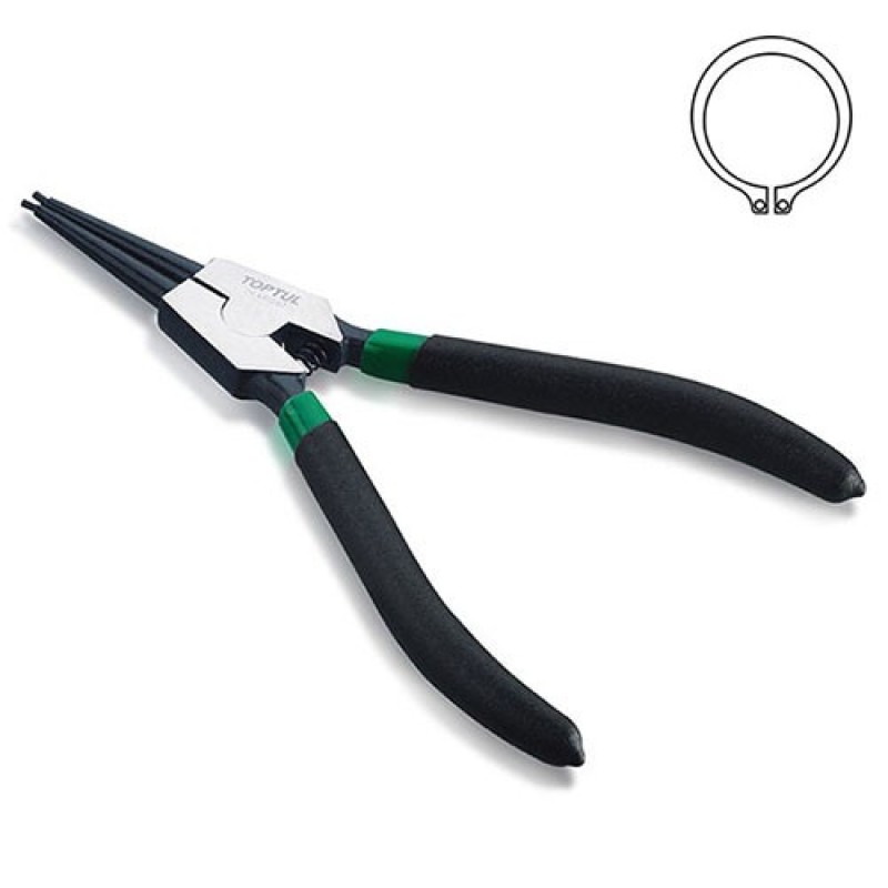 Знімач для зовнішніх стопорних кілець TOPTUL 7" (розжим прямі) DCAB1207. На сьогоднішній час у світі розроблено новаторами і зроблено величезну кількість різноманітного інструментарію по діагностиці і ремонту автотранспорту. Починаючи від простої викрутки і закінчуючи новітніми електронними приладами найвищої технічної точності. У кожного майстра з ремонту автомобіля в своєму особистому арсеналі повинен знаходиться інструмент для зняття і установок стопорних кілець. Так як без цього інструменту зняти або встановити стопорні кільця неможливо. Стопорні кільця поширені дуже широко і використовуються у вузлах де присутні з'єднання валів з отворами (найбільш часто при установці підшипників). Для такого виду роботи з деталями необхідно придбати такий вид інструмент, як круглогубці для стопорних кілець. Подібні прецизійні інструменти, призначені для виконання делікатної роботи. Круглогубці для стопорних кілець можна розділити на дві групи: моделі, що працюють на стиск (для отримання внутрішнього стопорного кільця) і на розжим (для отримання зовнішнього стопорного кільця). | Круглогубці для зняття стопорних кілець мають наконечники двох видів, прямий і зігнутої форми. Вибираючи круглогубці для стопорних кілець слід звернути свою пильну увагу на міцність губок. Адже інструмент виготовлений з неякісного матеріалу швидко приходить в непридатність. У виготовленні інструментарію виробництва TOPTUL (Тайвань) використовуються багатокомпонентні марки сталі з використанням стійкого до окислення сплаву хром - ванадій. Вислизанню інструменту з рук перешкоджає обрезиненное покриття ручок, що сприяє значному їх комфортного використання.