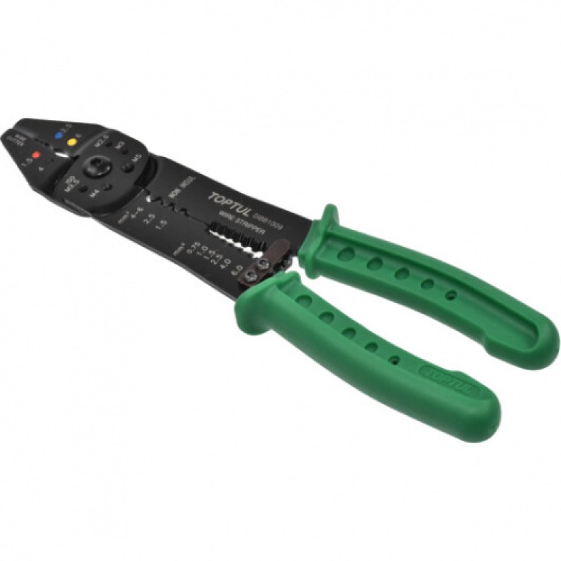 Стриппер-кримпер TOPTUL DIBB1009. Кліщі для обтискання клем і зняття ізоляції. Довжина: 225 мм Ø для ізолер. клем: 1,5; 2,5; 4; 6 мм2 для болторізу: М2,6; М3,5; М4; М5 для не ізолір. клем: 1,5; 2,5; 4-6 мм2 для зачистки проводов: 0,75; 1,0; 1,5; 2,5; 4,0; 6,0 мм2 З вбудованими кусачками.