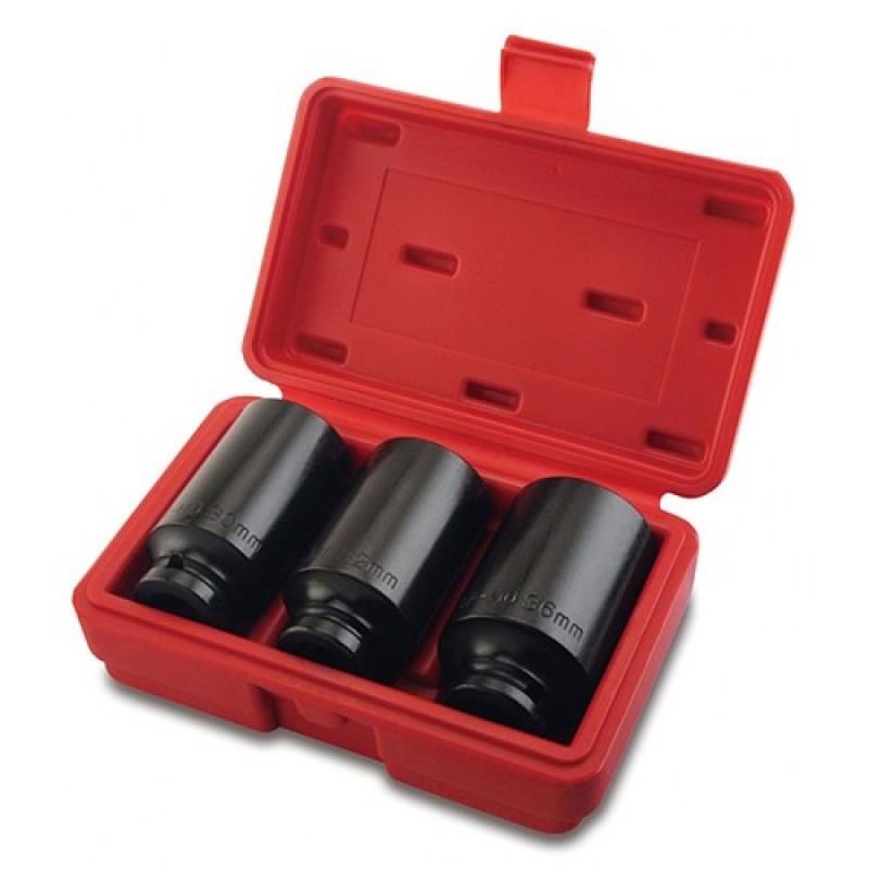 Усиленные ударные 12-гранные длинные головки, профессиональные, изготовлены из закаленной хроммолибденовой стали. Применяются для ступичных гаек, где требуется высокий крутящий момент. Набор содержит три головки с наиболее распространенными размерами гаек ступицы. Черное фосфатное покрытие повышает коррозионную стойкость. Подходит к Audi, VW, Alfa, BMW, Citroen, Fiat, Ford, Mercedes-Benz, Opel, Peugeot, Renault и т.д.