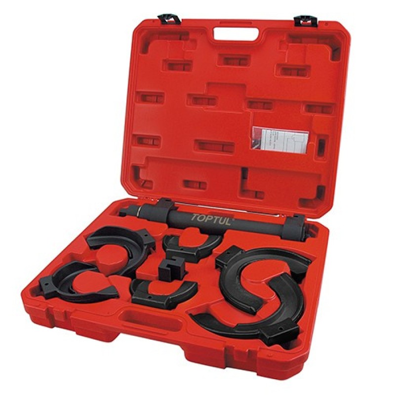 Стяжка пружин універсальна , спеціально розроблена для підвіски Макферсона, використовуючи три комплекти змінних монолітних комплекту для стяжки. Стяжка пружин на всіх типах підвіски Макферсона. Підходить для BMW , Toyota , Ford, Mitsubishi , VW, Audi, Seat , Nissan, Honda , Toyota , Subaru , Volvo, Opel і Porsche . Матеріал : хром -молібденова сталь . Діапазон стиснення/расжатия пружин: 80-115 мм, 110-150 мм, 140-195 мм. Максимальне завантаження 3,500 кг