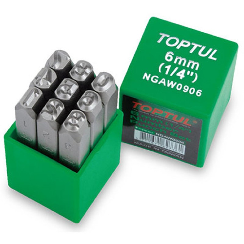 Клеймо цифри по металу TOPTUL 9ед. 5мм NGAW0905, виготовлений з хром-ванадієвої сталі. Набір з 9 клем з номерами від 0 до 9 (перевернувши номер 6 отримаємо 9). Упакований в міцний пластиковий корпус.